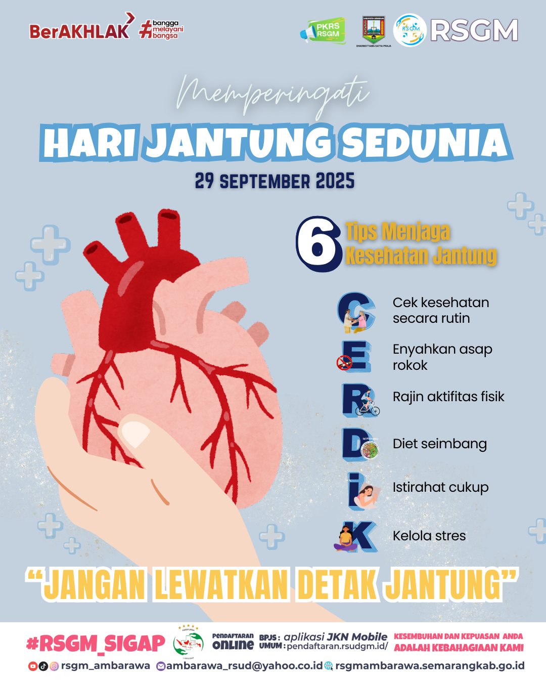 aga jantungmu dengan pola hidup CERDIK: Cek rutin ✅ Enyahkan rokok 🚭 Rajin olahraga 🏃 Diet seimbang 🥗 Istirahat cukup...